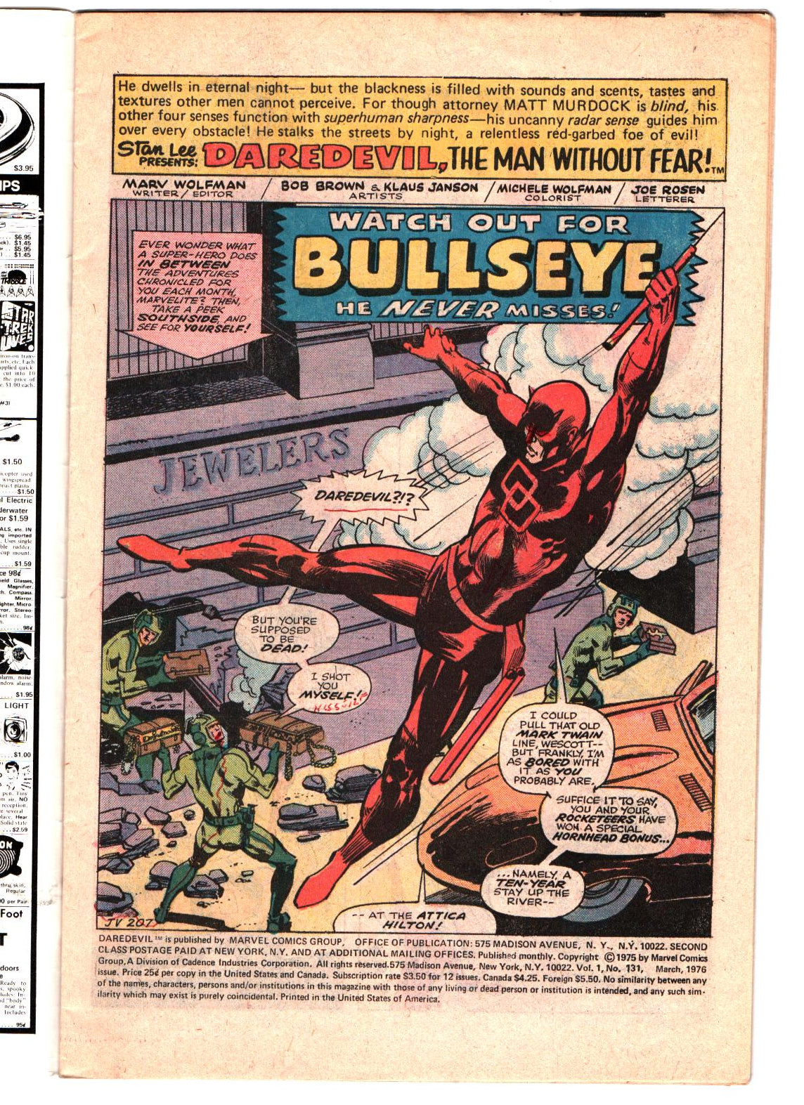 DAREDEVIL #131 (1976) 1ST APPEARANCE OF BULLSEYE; 1ST APPEARANCE OF THE ROSE III (JACOB CONOVER) VGFN/FN-